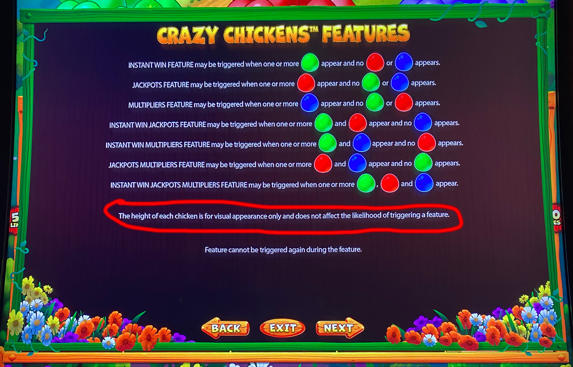 No. The height of the green, red and blue chickens does not indicate how close you are to triggering any of the features. The game rules state, “The height of each chicken is for visual appearance only and does not affect the likelihood of triggering a feature.”