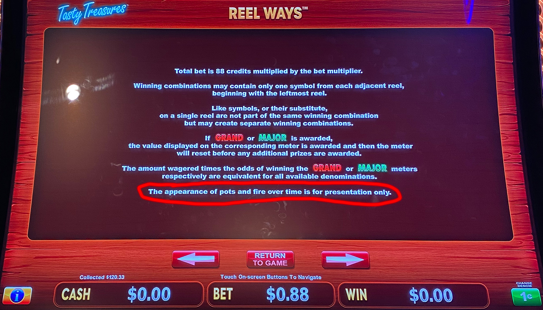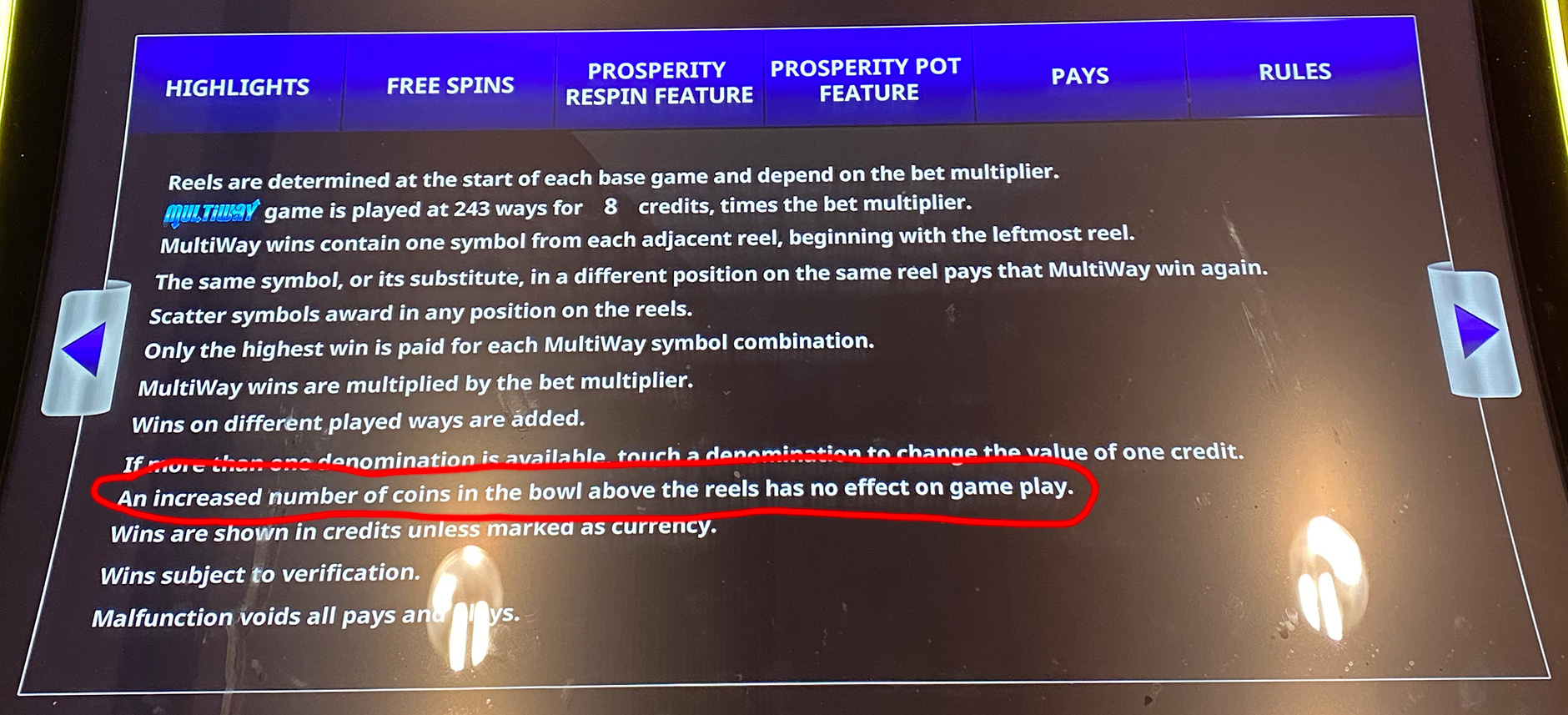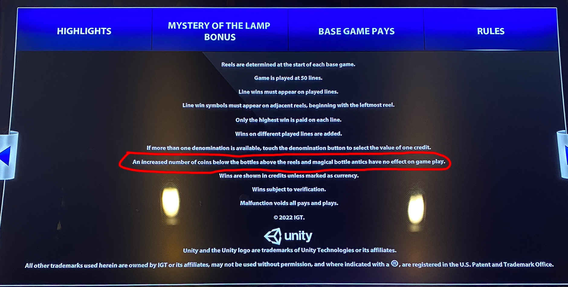 Look for language (often located on the last page of the rules screen) describing the graphics like “has no effect on game play” or “for entertainment purposes only.” The rules below are from Magic Treasures (which, confusingly, is an actual advantage game, but the advantage comes from the numerical Money Balls counter rather than the piles of coins contained within the pots).