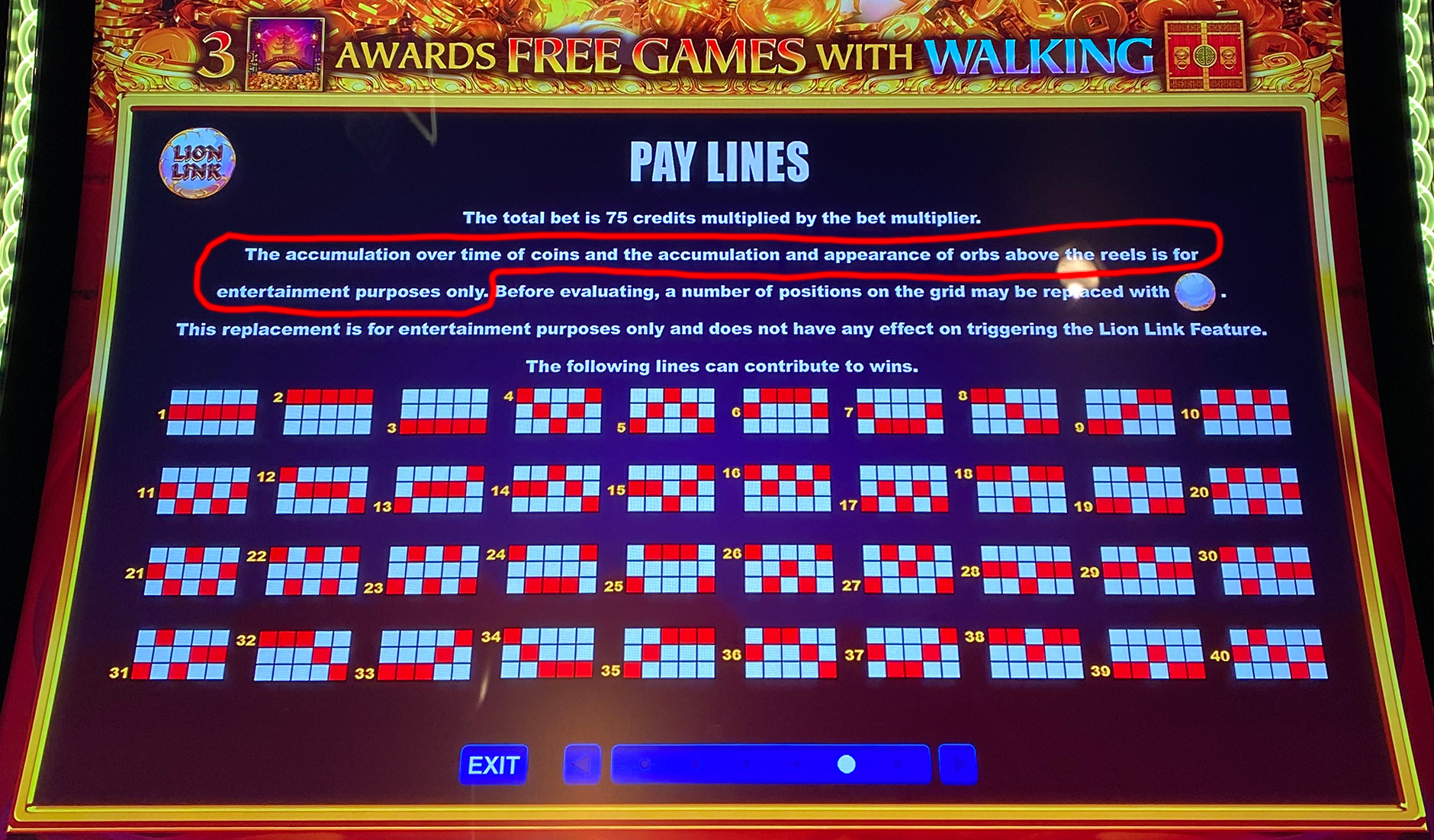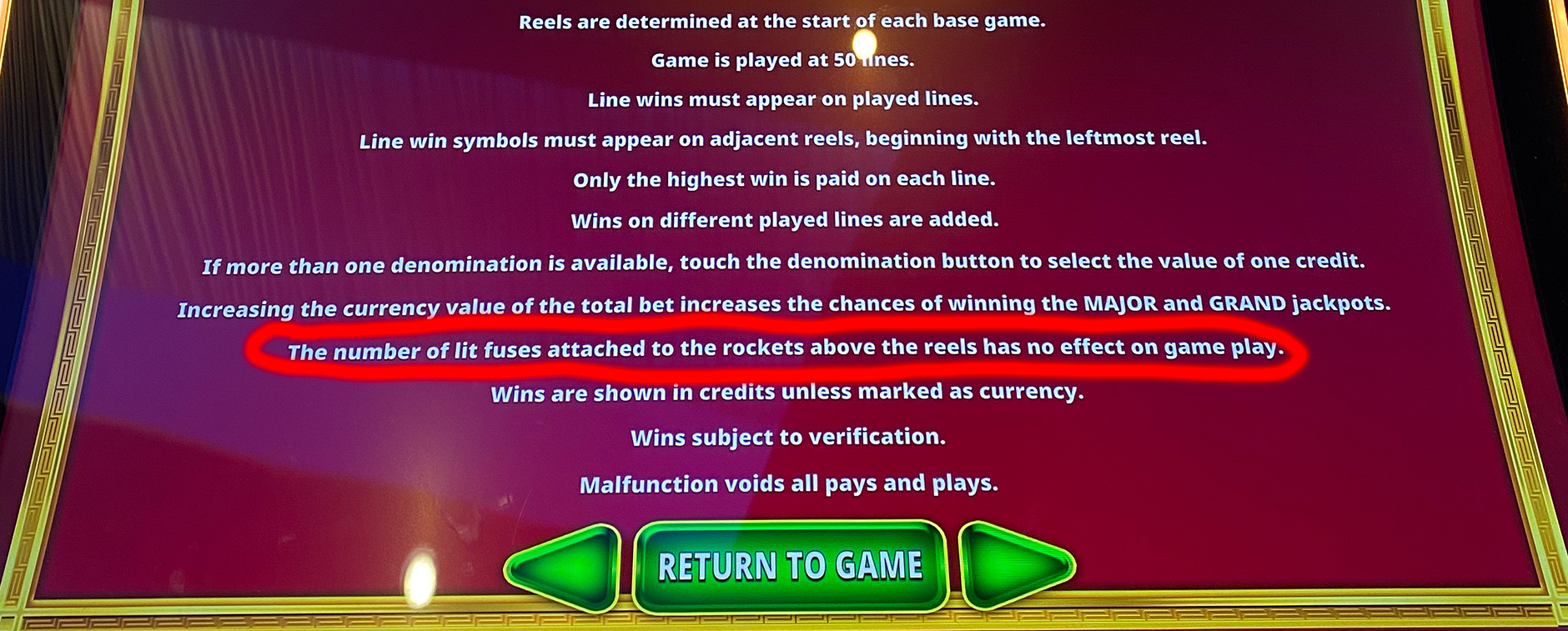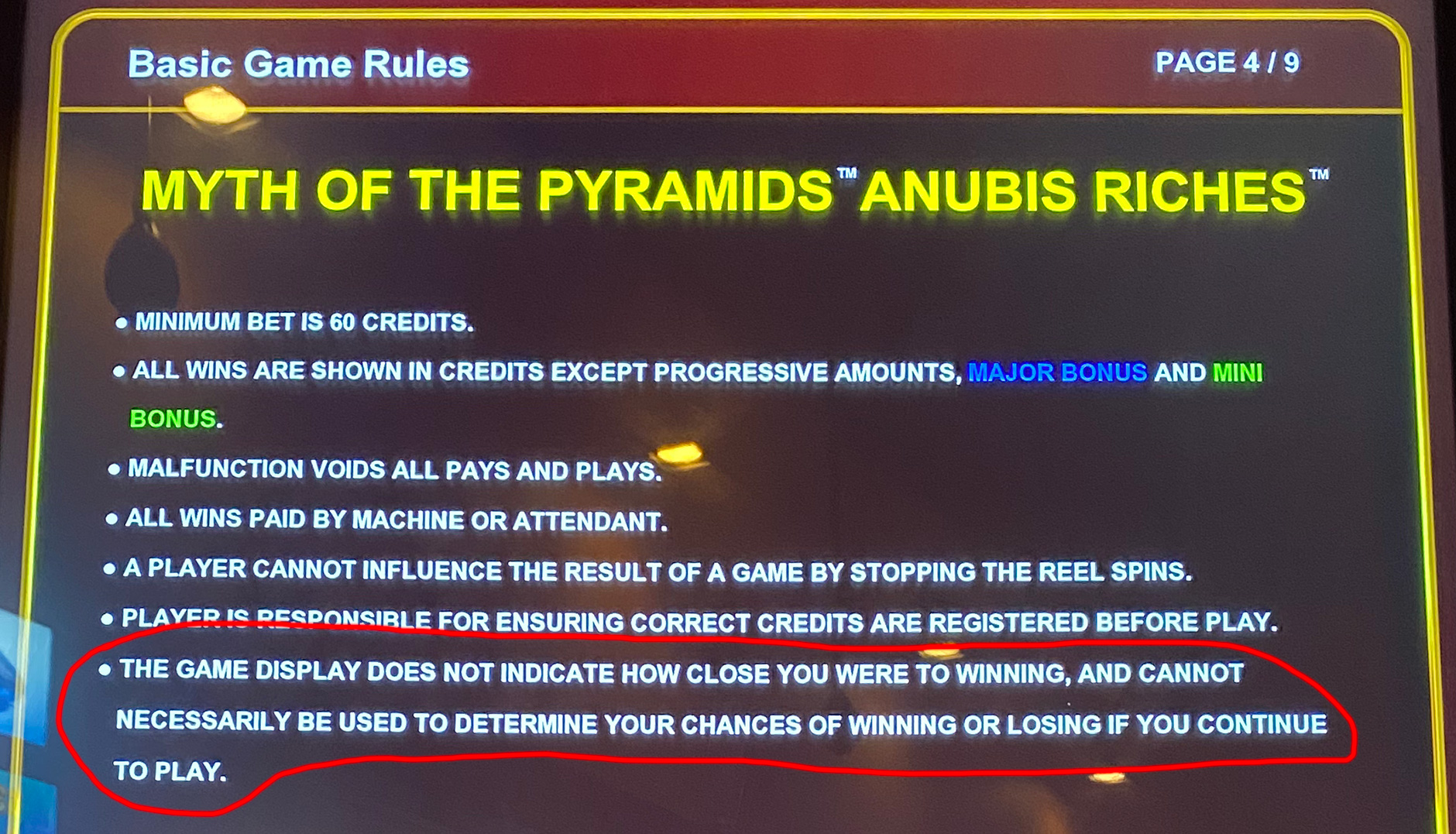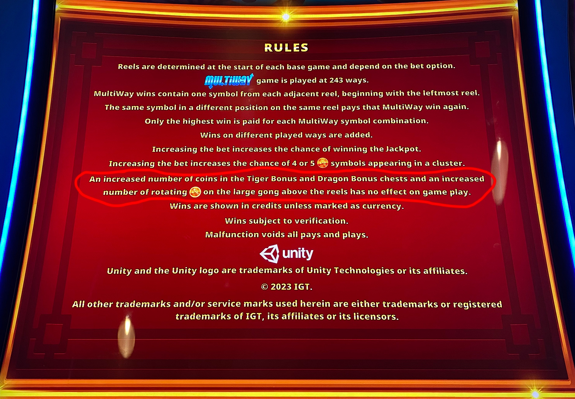 Look for language (often located on the last page of the rules screen) describing the graphics like “has no effect on game play” or “for entertainment purposes only.” The rules below are from Magic Treasures (which, confusingly, is an actual advantage game, but the advantage comes from the numerical Money Balls counter rather than the piles of coins contained within the pots).