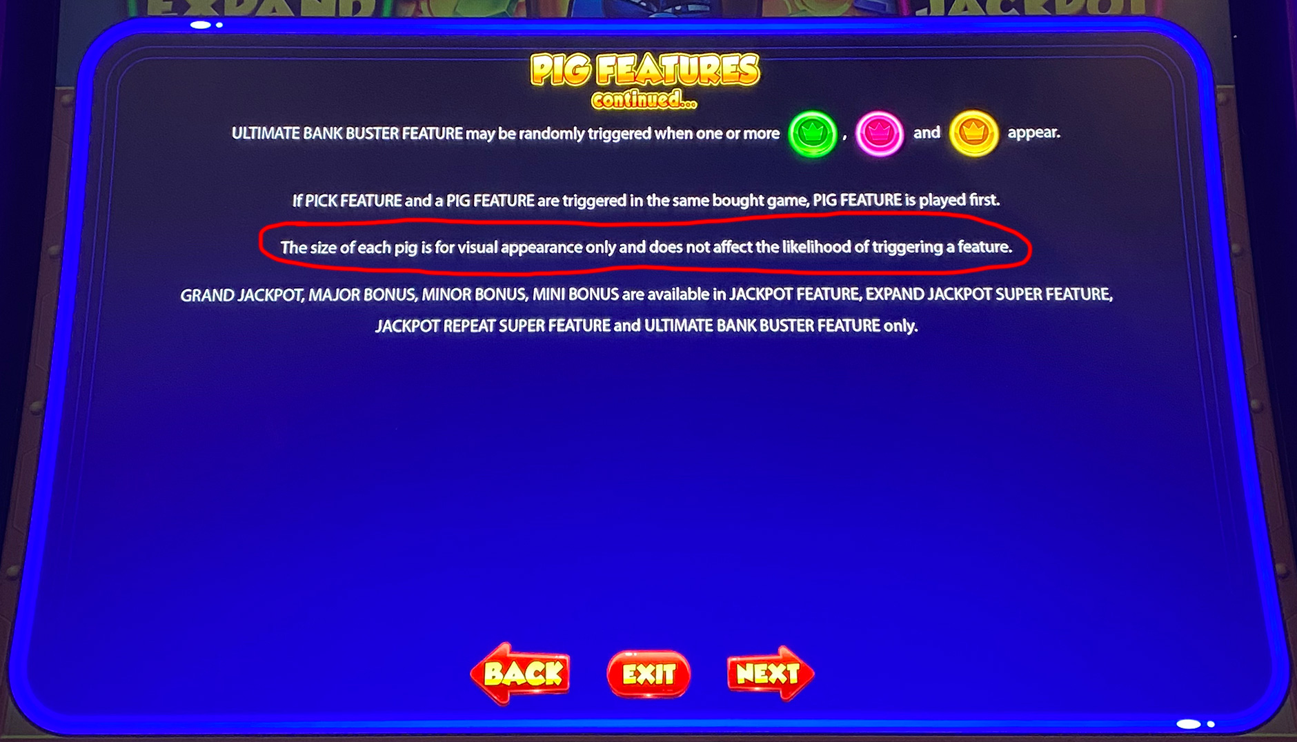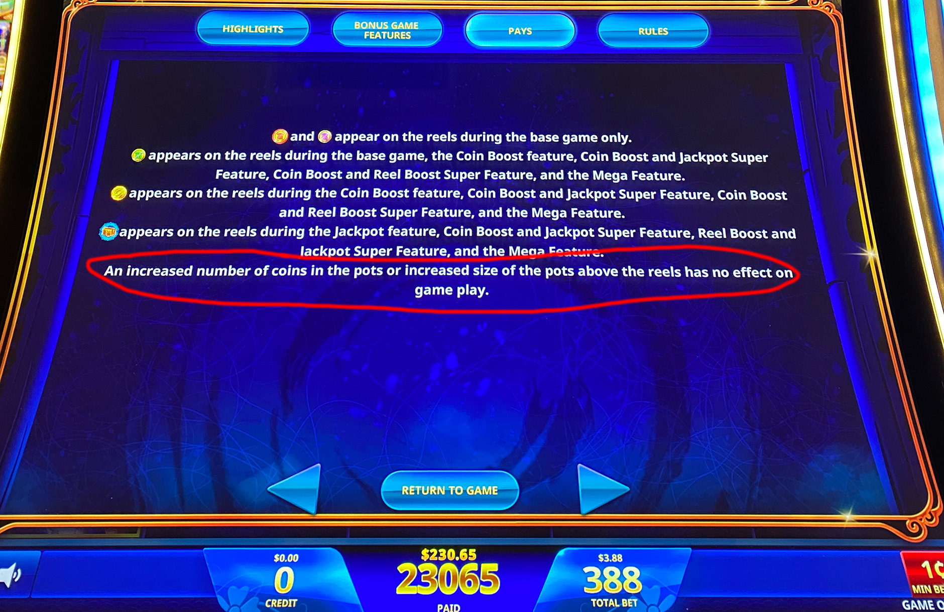 Notice how it says, “An increased number of coins in the Money Balls Bonus pot, Free Games Bonus chest, and Jackpot Bonus coin pile has no effect on game play.”