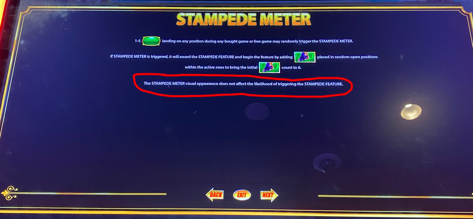 No. The green Stampede Meter that fills in does not indicate how close you are to triggering any of the features. The game rules state, “The STAMPEDE METER visual appearance does not affect the likelihood of triggering the STAMPEDE FEATURE.”