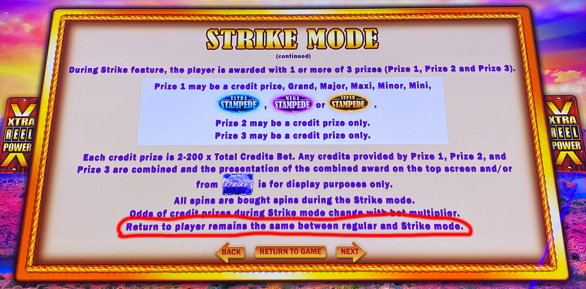 No. Every 8 to 12 minutes a “Strike Mode” features activates and lasts for 3 minutes. The game rules state, “Return to player remains the same between regular and Strike mode.”