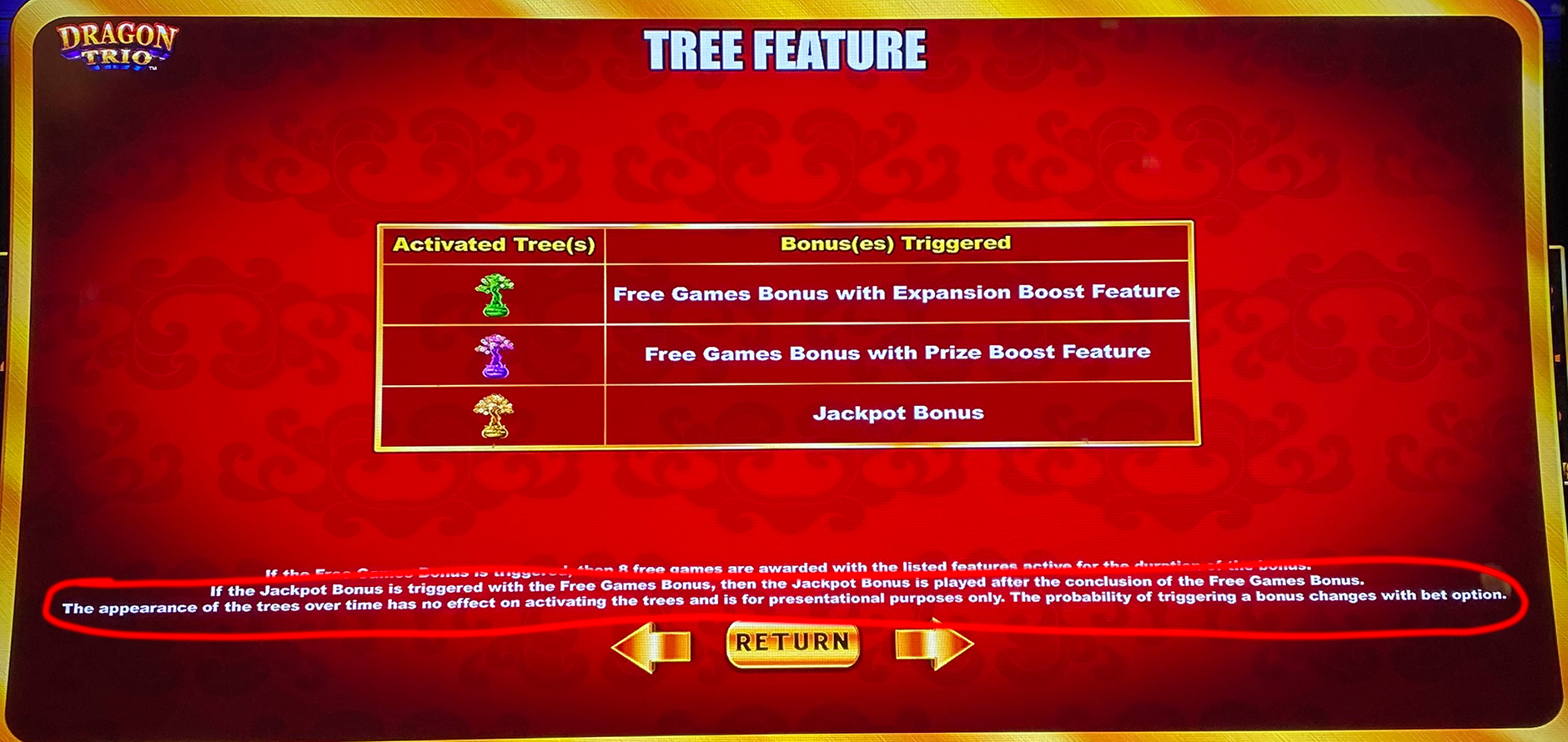 No. The purple, yellow and green trees (Prize Boost, Jackpot Bonus and Expansion Bonus) do not indicate how close you are to triggering any of the features. The game rules state, “The appearance of the trees over time has no effect on activating the trees and is for presentational purposes only.”