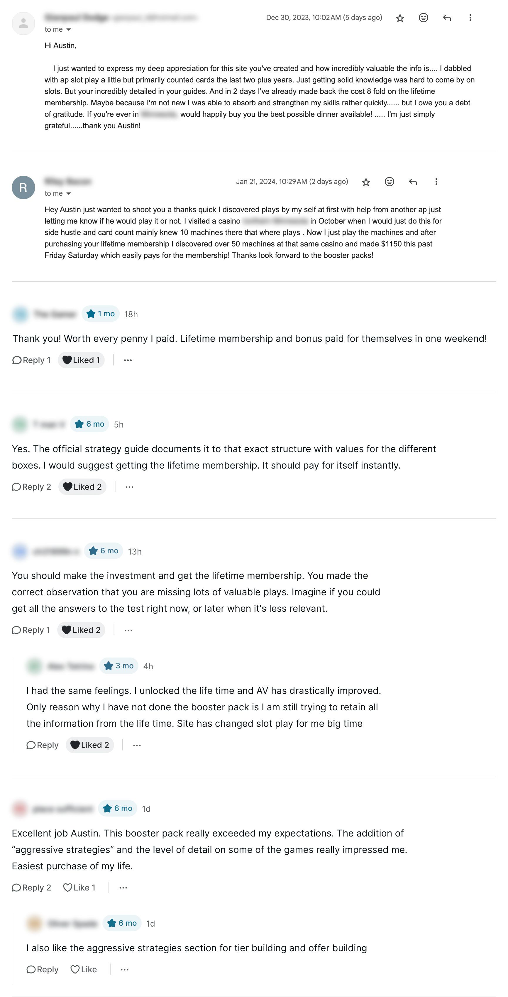 My policy is to not list all of the games included because knowing about the games is part of what you are paying for. 25 games is a lot of games, so you will likely find plenty of options available at your local casino. If you discover one new game that you didn’t know about, that could easily cover the cost of the entire product. And you could lose way more than $300 gathering data to figure out entry points on a new game yourself. So the idea is that the Booster Packs pay for themselves if you are a serious AP.